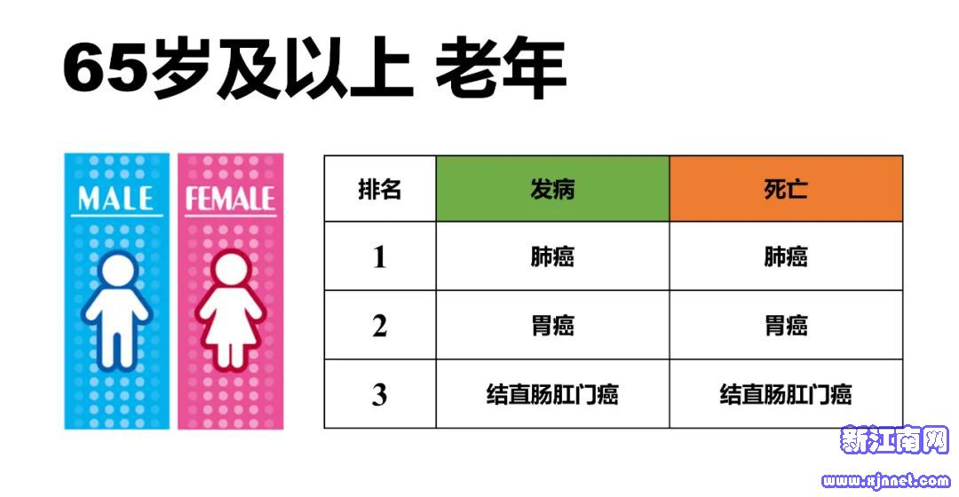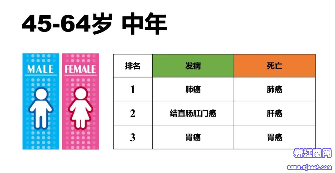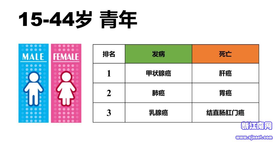 青年、中年和老年人群恶性肿瘤发病和死亡前3位情况如下: