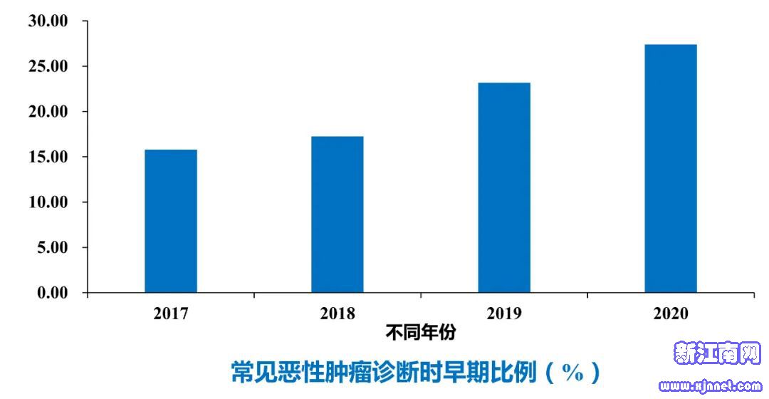 常见恶性肿瘤诊断时早期比例不断上升,从2017年的15.79%上升到2020年的27.38%。