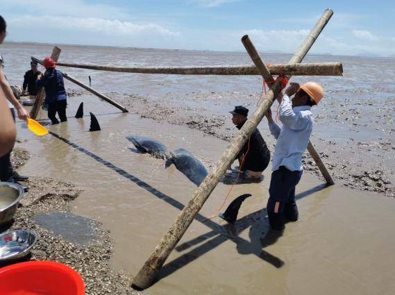 由于当时正是退潮期间,水位较低,执法小艇无法驶入该区域,11名执法人员选择在大竹山上岸,前往北洋坝开展救援。到达现场后,执法人员发现一共有12头鲸豚(疑似)搁浅在滩涂上,执法人员和已经在现场的乡镇、公安、消防等工作人员一起分工合作,一部分在岸边挖水坑,然后四五个人为一小组,将搁浅在滩涂上的生物,一头一头地扛到挖好的水坑里,并为它们盖上湿毛巾,不断地给它们的身上浇水,防止身上的水分蒸发。
