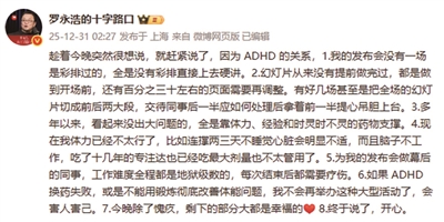 2025年12月31日凌晨,罗永浩在微博发文回应“科技春晚”发布会迟到40分钟事件,首次公开坦承自己受注意缺陷与多动障碍(ADHD)困扰多年。