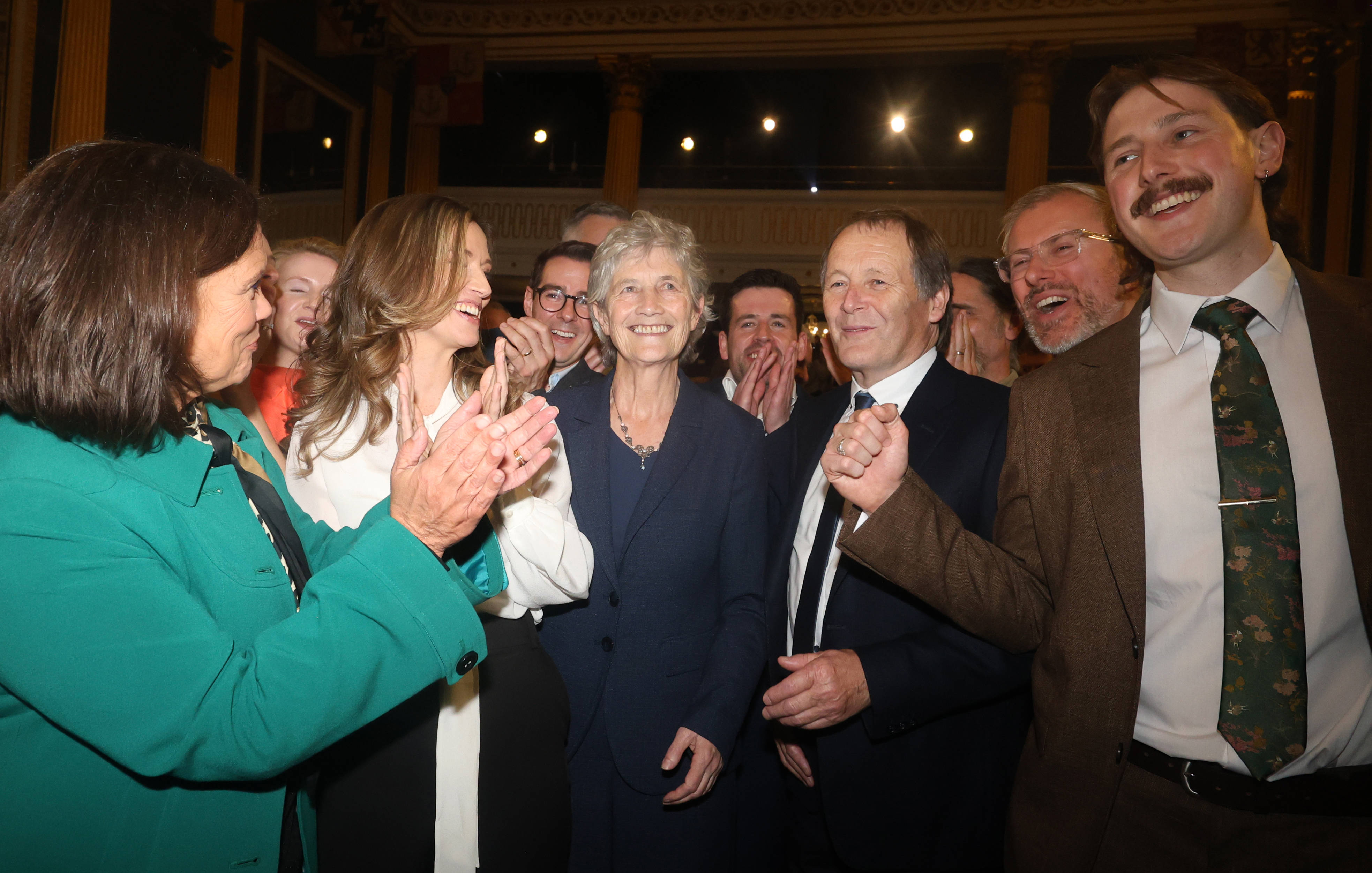 10月25日,在爱尔兰首都都柏林,凯瑟琳·康诺利(前左三)获胜后接受祝贺。 新华社发(埃蒙·法雷尔摄)