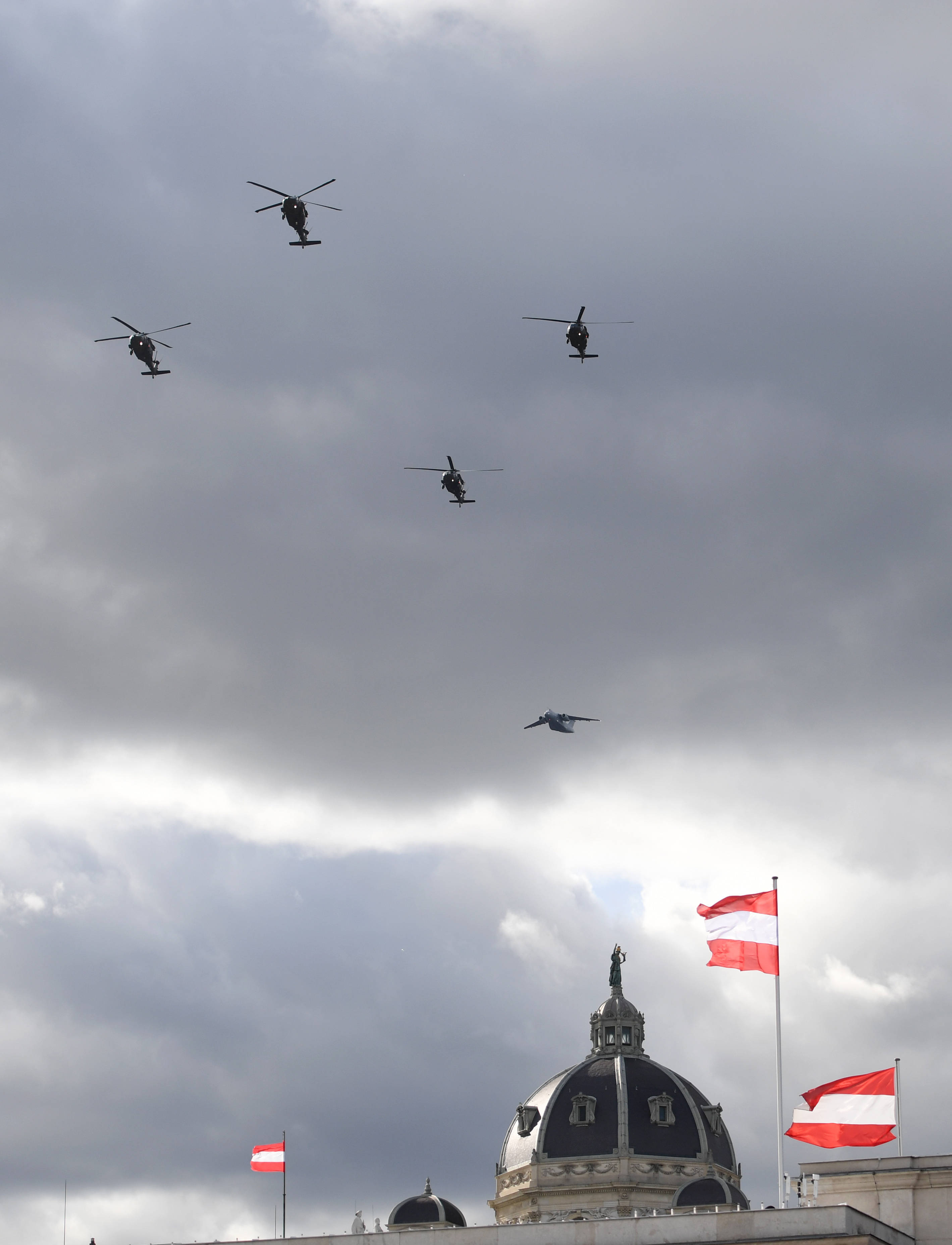 10月26日,在奥地利维也纳,直升机编队飞过霍夫堡。 新华社记者 贺灿铃 摄