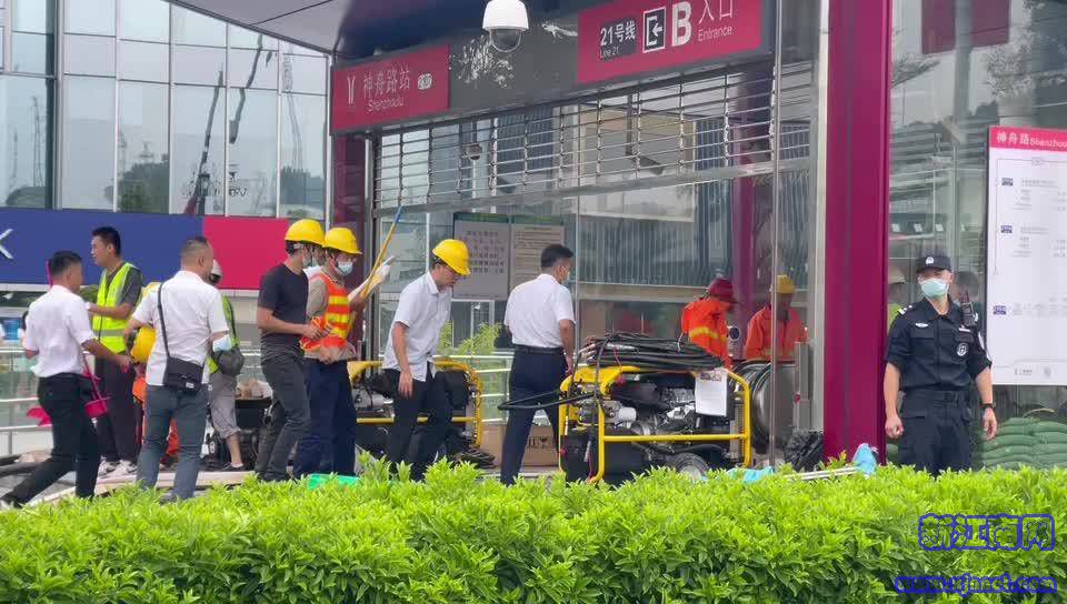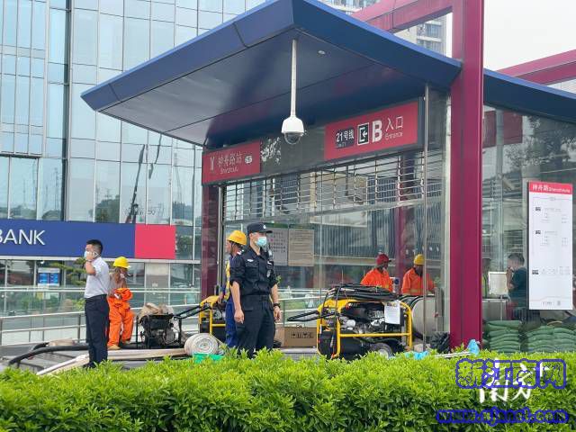 下午三时许,记者在现场看到,目前,神舟路地铁站两个地铁出入口均已关闭,且周围已有围栏围住,多位民警、安保人员、地铁工作人员在地铁口维持秩序。同时,神舟路地铁站B口有排水管道从地铁口伸出,管道持续不断排出泥水。