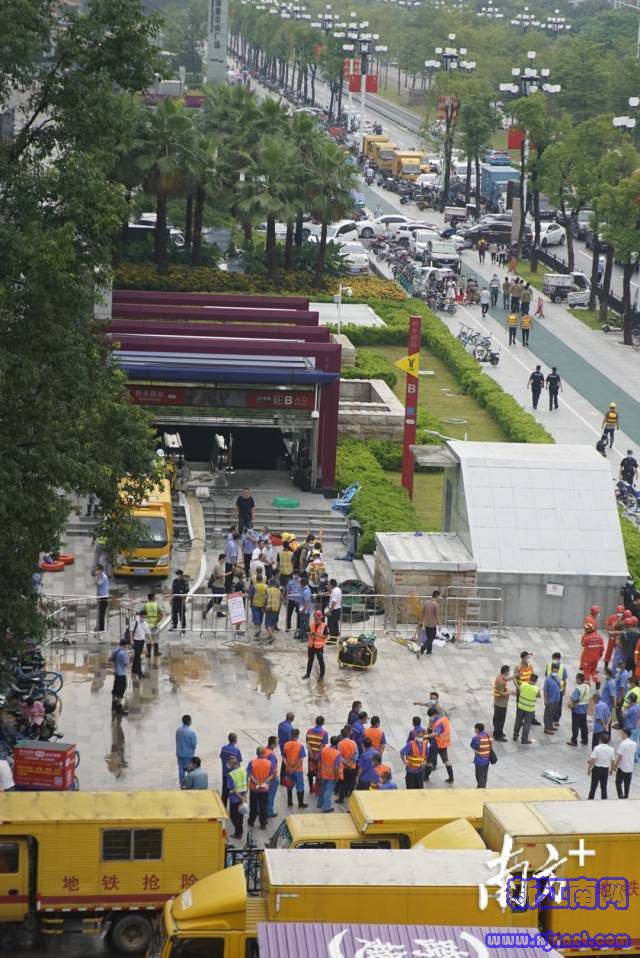 广州科学城排水管理有限公司,广州自来水工程有限公司,广州地铁抢险车辆等多个公司的救援抢险工作人员在神舟路站地铁口。地铁口边还有三辆消防车停放。