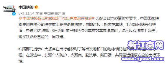 为配合各地疫情防控要求,中国国家铁路集团有限公司决定推出免费退票措施,自即时起,旅客在车站、12306网站等各渠道,办理2021年8月3日24时前已购各次列车有效车票退票时,均不收取退票手续费,购买铁路乘意险的一同办理。