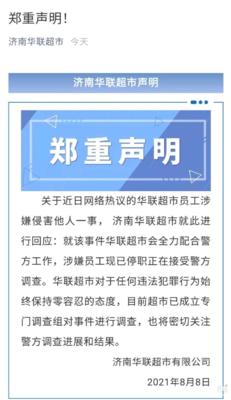 8月8日济南华联超市发布声明称,就阿里女员工自述被猥亵事件,涉嫌员工现已停职正在接受警方调查,目前超市已成立专门调查组对事件进行调查。