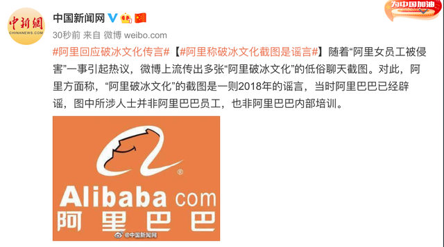 此外,随着“阿里女员工被侵害”一事引起热议,微博上流传出多张“阿里破冰文化”的低俗聊天截图。对此,阿里方面称,“阿里破冰文化”的截图是一则2018年的谣言,当时阿里巴巴已经辟谣,图中所涉人士并非阿里巴巴员工,也非阿里巴巴内部培训。(中新网)