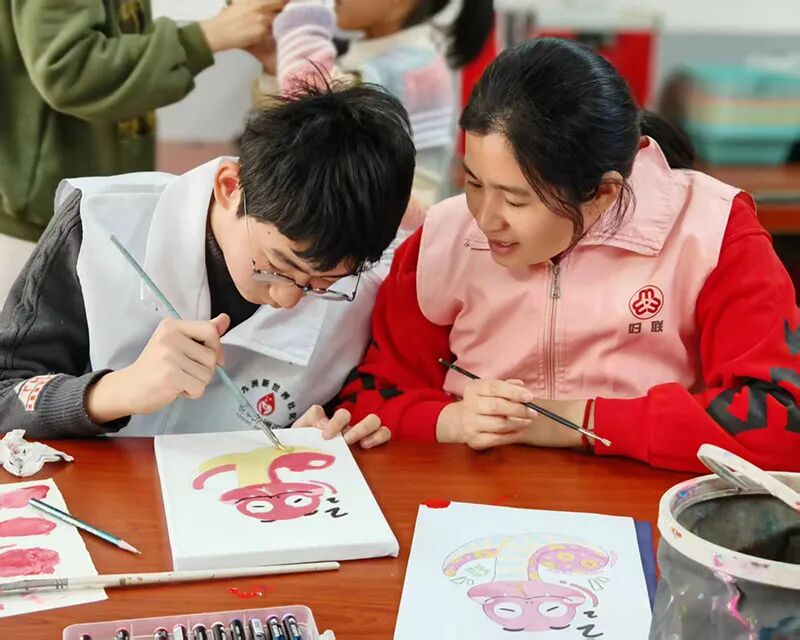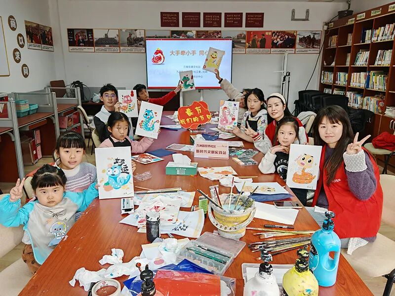 九洲新世界社区社工室、“悦享九洲汇”志愿者联盟联合辖区单位三原色艺术培训中心开展我们的节日▪春节“大手牵小手 同心绘新春”亲子绘画活动,乐融融共绘灵蛇,喜盈盈共祝新春。