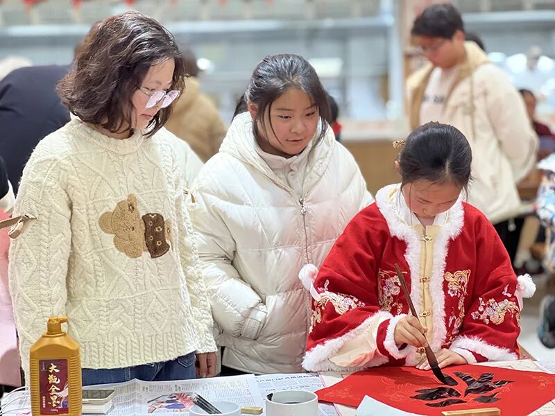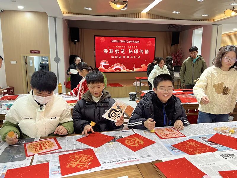 在浦陵社区“兰邻膳”社区食堂,青少年在指导老师的帮助下,体验了手工拓印,将福字转化为一幅幅精美的拓片。社区内的书法爱好者们展示了他们的书法技艺,现场挥毫泼墨,书写了一幅幅寓意吉祥的福字,表达了对新一年的美好祝愿。