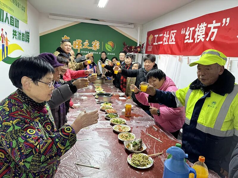 工二社区“红模方爱心食堂”联合社会组织普康养老,邀请困难家庭共享爱心年夜饭。一道道热气腾腾的菜肴摆满餐桌,“帮扶”模力团志愿者们与大家围坐在一起,谈天说地,嘘寒问暖,让这些平日里略显孤单的人们,在欢声笑语中感受到家的温暖与亲人般的关怀,共同度过一个温馨难忘的新春佳节。