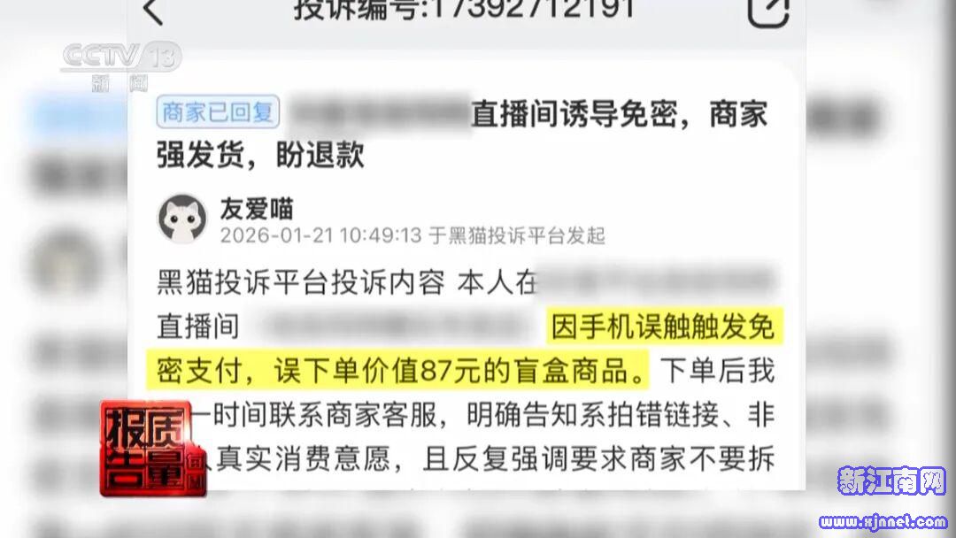 这位消费者表示,在看直播时被诱导,误点免密支付购买了不需要的盲盒,无法退款。