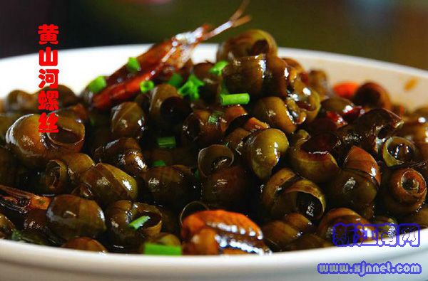 黄山风味小吃。黄山市境内溪水清澈,浅底尽沙,没有污染,所产之螺丝,质地高出田螺一筹。肉青白细嫩,且无泥腥气。黄山河螺丝略小于田螺,加工时,先剪去其尾端,配上油、盐、葱、姜、醋,入锅烧炒,滋味特别鲜美,深受食客喜爱。