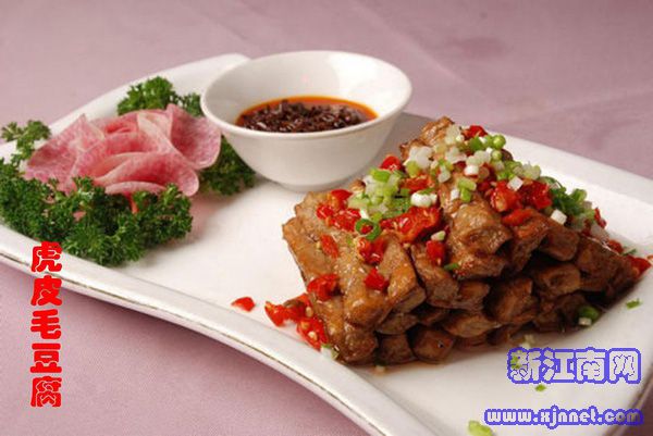 黄山传统名菜。因利用豆腐进行人工发酵,让其表面生长出一层白色的茸毛(白色菌丝),在发酵过程中蛋白质分解成多种氨基酸,味道比一般豆腐鲜美。 “虎皮毛豆腐”因茸毛经煎炕后呈虎皮条纹而得名。