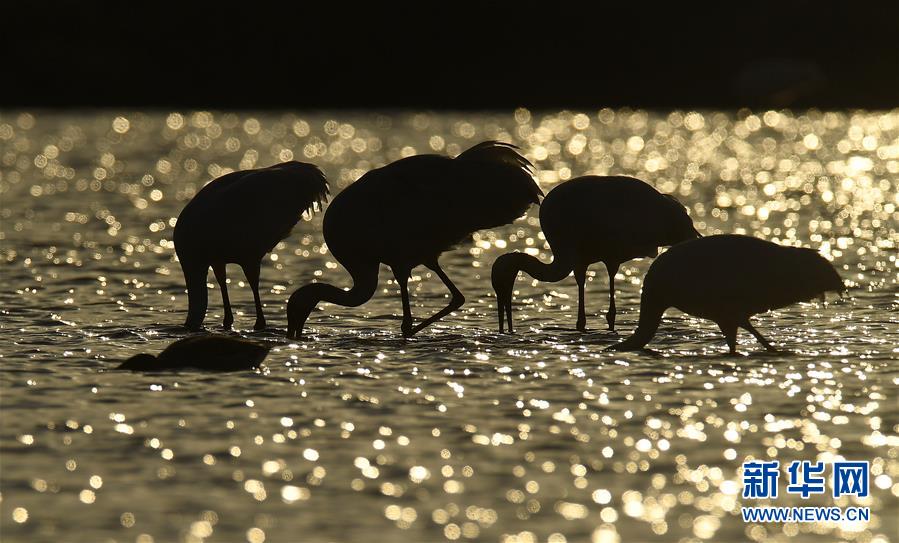 白鹤在位于鄱阳湖畔的五星农场湿地觅食(1月10日摄)。在江西省南昌市鄱阳湖边的五星农场,来此越冬的国家一级保护鸟类白鹤展翅起舞,姿态万千。 新华社记者 万象 摄