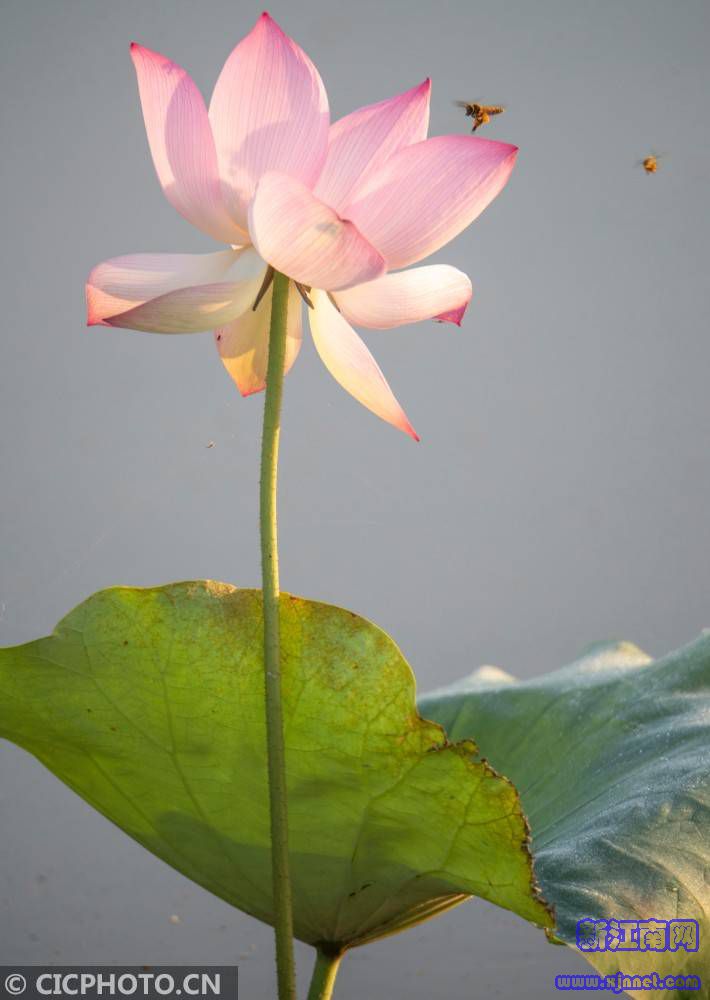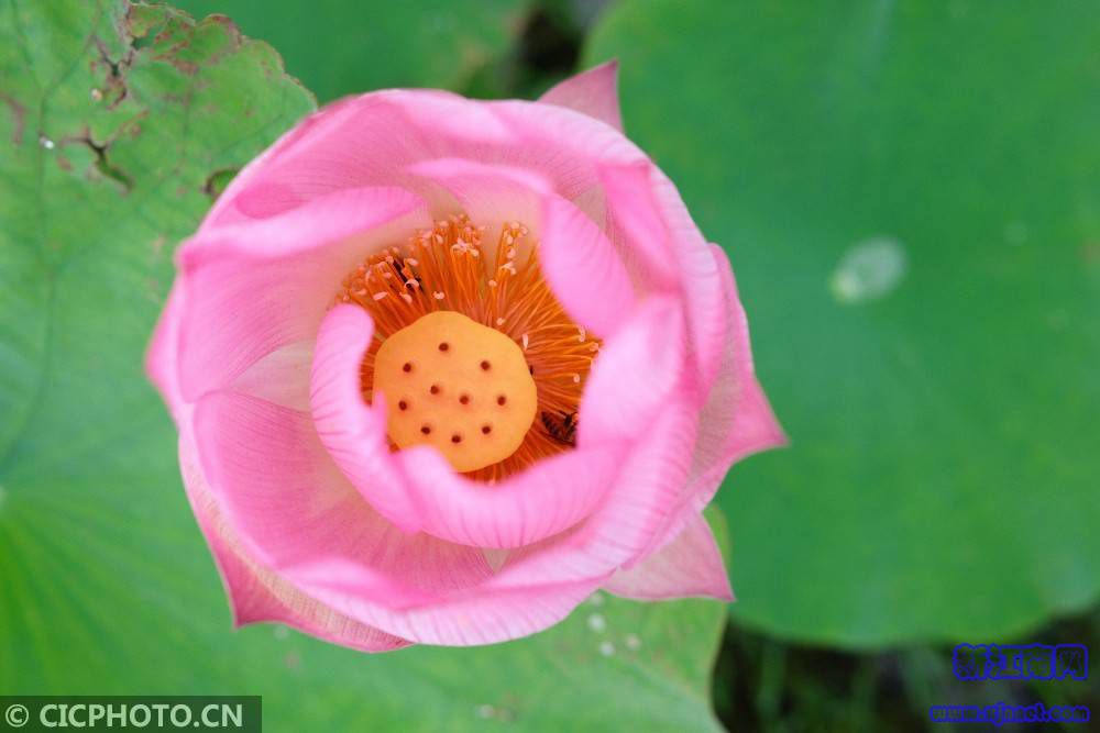 ↑2021年6月3日,海南省琼海市龙寿洋万亩田野公园,蜜蜂在荷花上采蜜。CICPHOTO/蒙钟德 摄