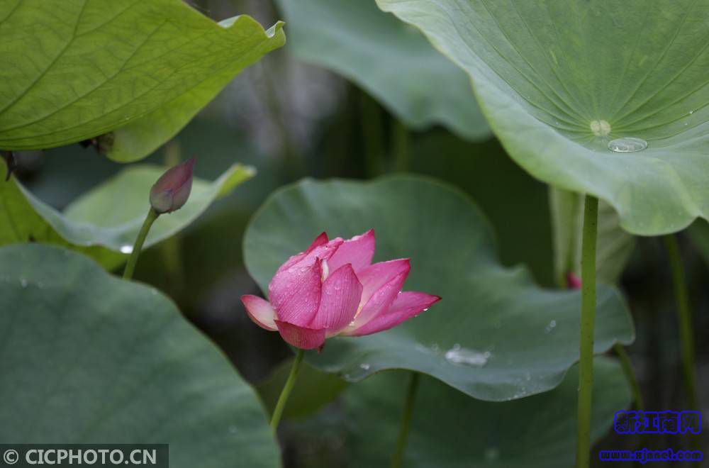 ↑2021年5月20日,浙江省金华市武义柳城畲族镇十里荷花景区物种园的荷花在雨中绽放。CICPHOTO/张建成 摄