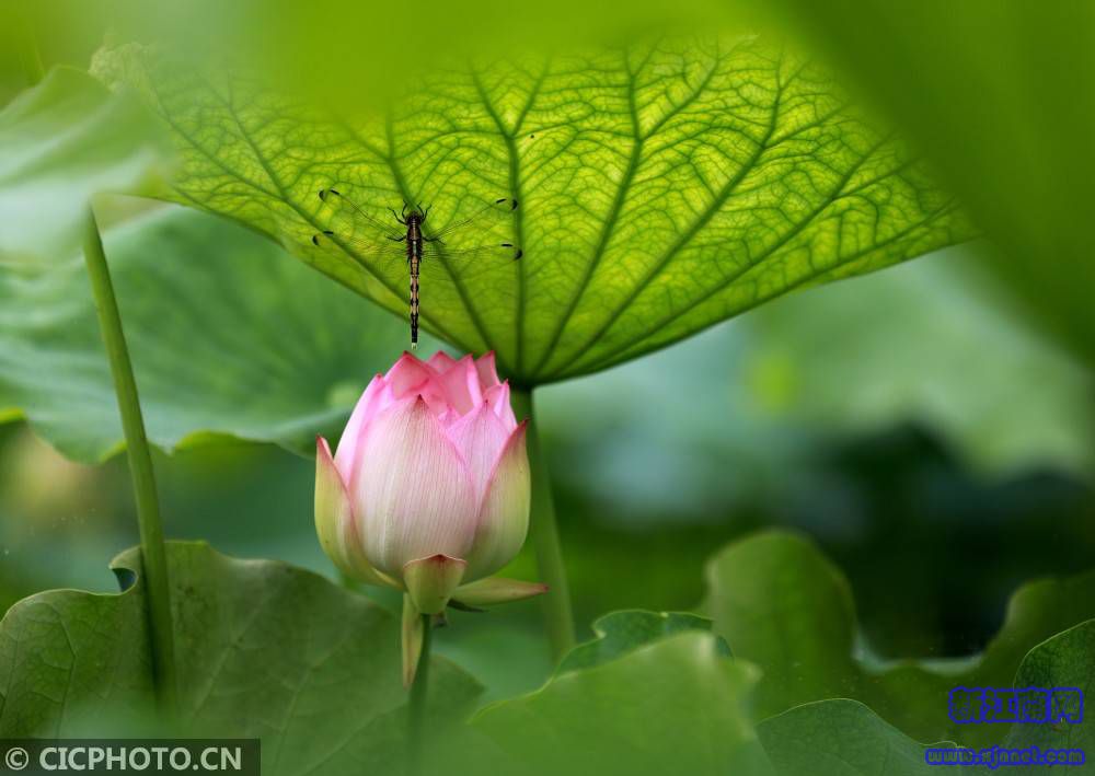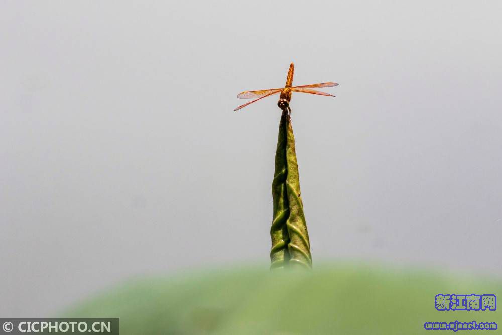↑2021年5月30日,在江苏省淮安市楚秀园,一只蜻蜓落在荷叶上。CICPHOTO/贺敬华 摄