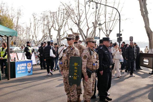 春节期间,杭州西湖景区迎来客流高峰,武警浙江总队杭州支队官兵科学研判客流变化,及时调整执勤部署,与属地巡特警一道采取“定点+徒步”巡逻的方式,全力守护人民群众平安出游。(王达、陈杰)