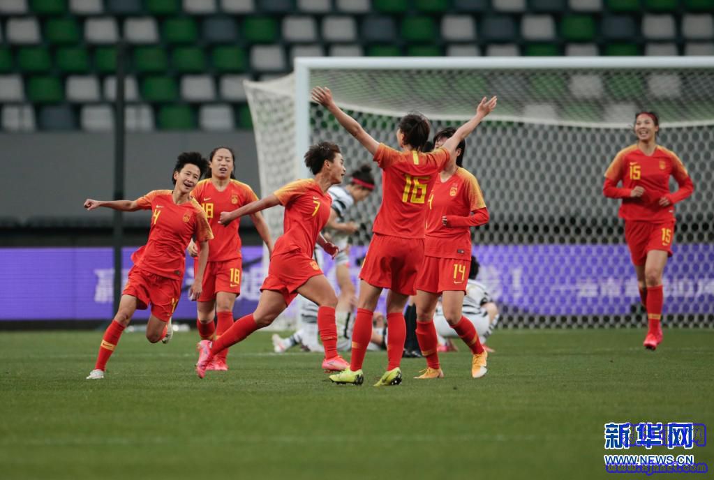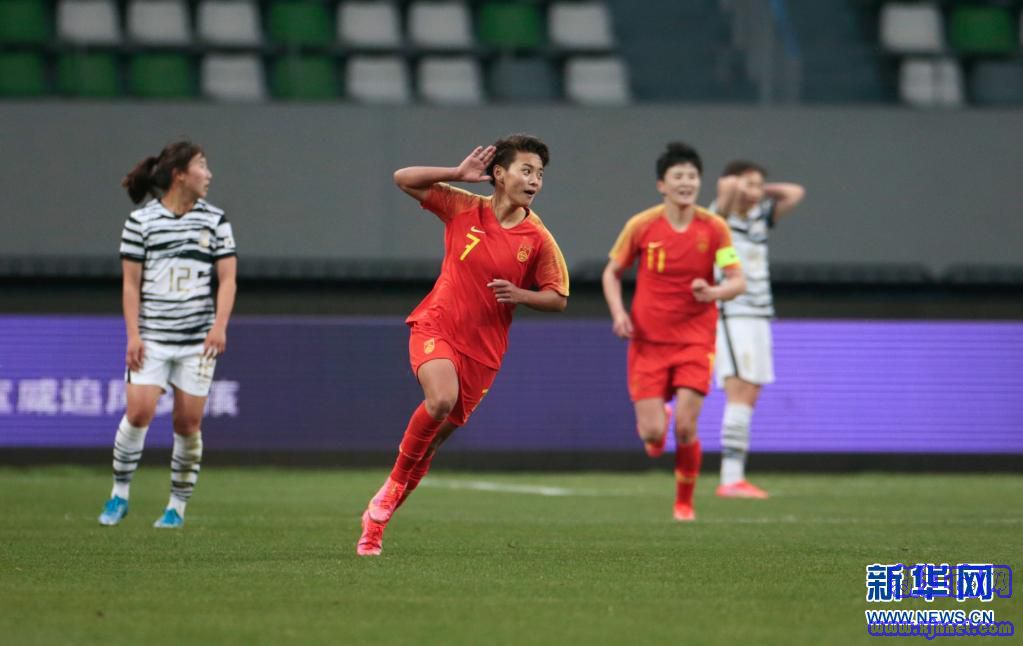 4月13日,中国队球员王霜(中)在比赛中庆祝进球。新华社记者 丁旭 摄