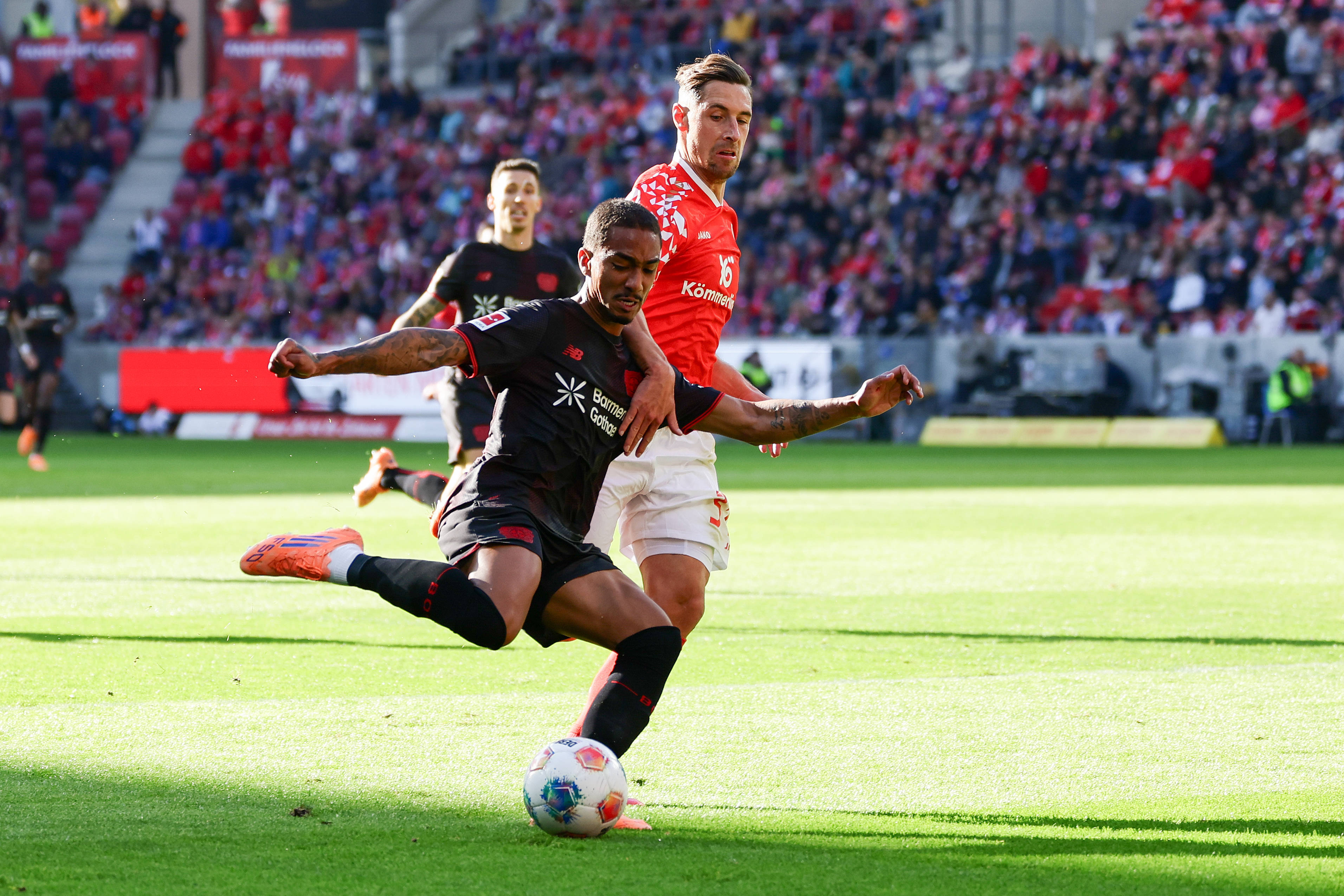 10月18日,美因茨队球员姆韦内(右)和勒沃库森队球员格里马尔多在比赛中拼抢。 新华社发(约阿希姆·毕瓦勒兹摄)