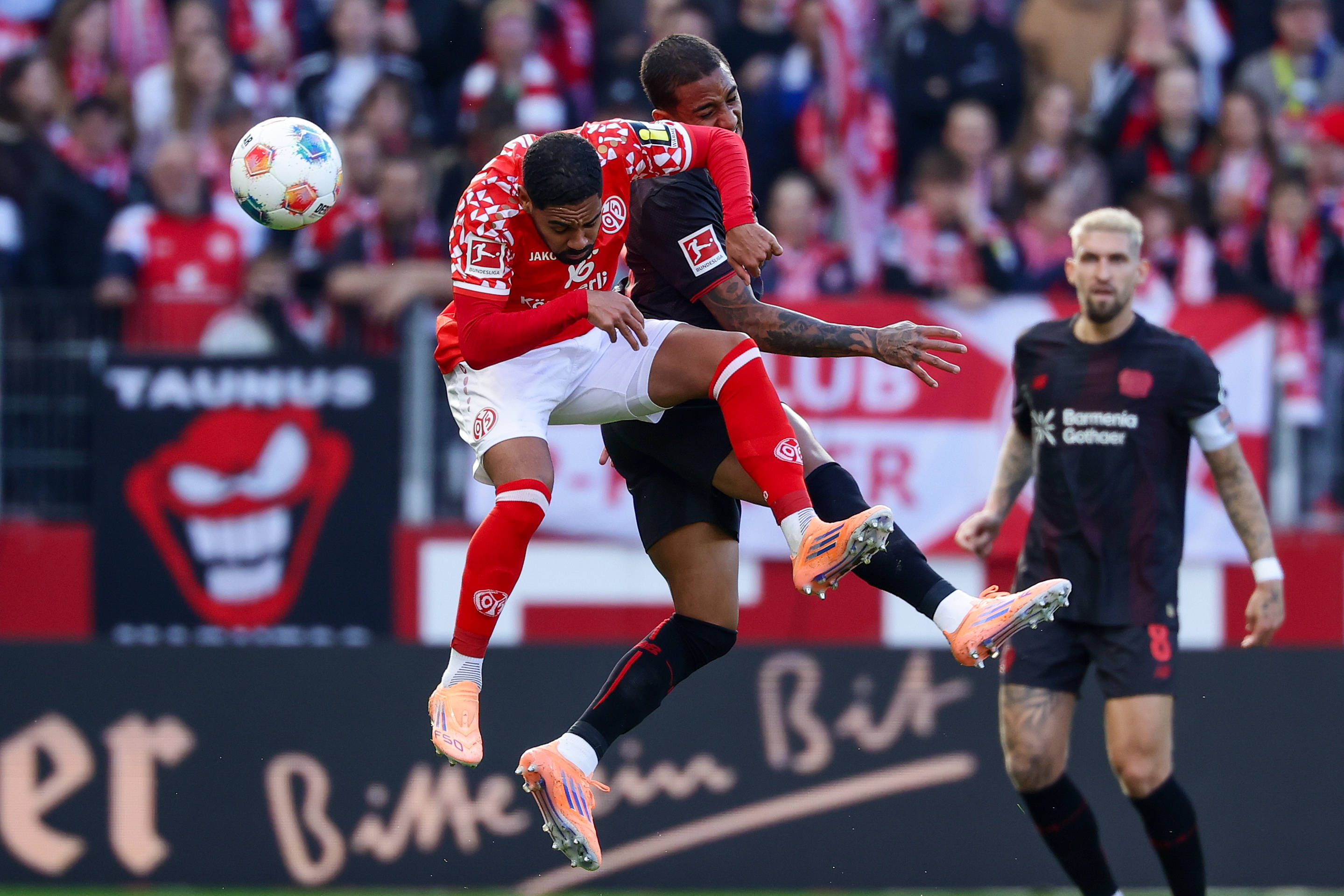 10月18日,美因茨队球员姆韦内(左)和勒沃库森队球员阿图尔在比赛中争顶头球。 新华社发(约阿希姆·毕瓦勒兹摄)