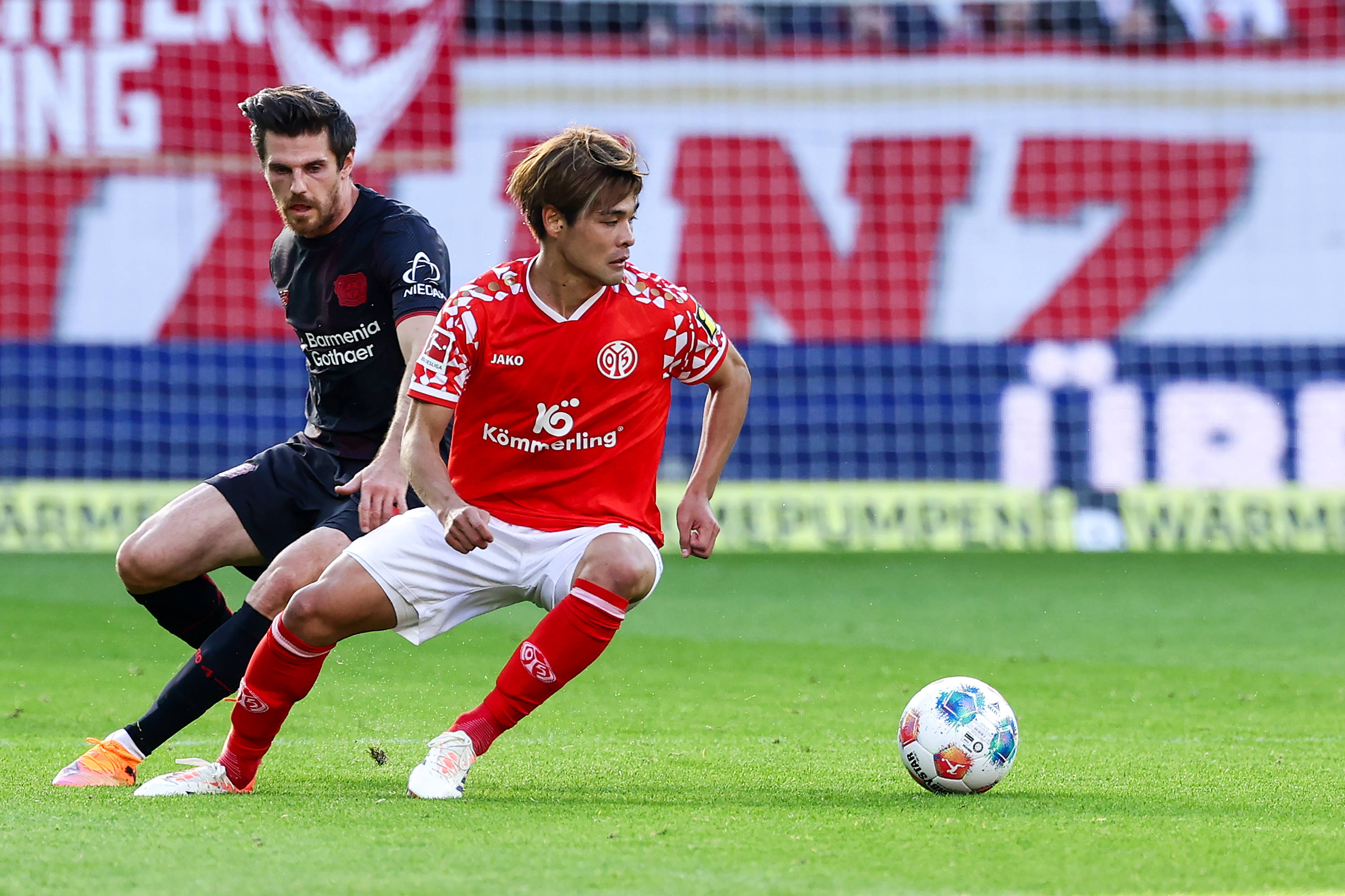 10月18日,美因茨队球员佐野海舟(右)和勒沃库森队球员霍夫曼在比赛中拼抢。 新华社发(约阿希姆·毕瓦勒兹摄)