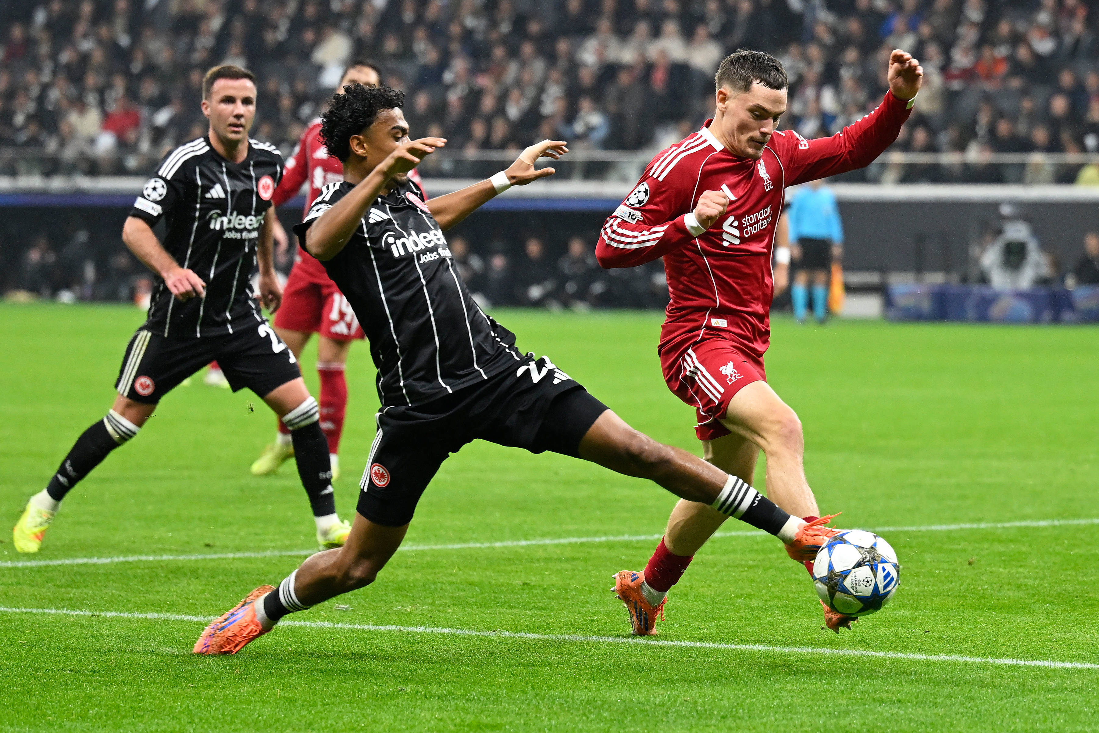 10月22日,法兰克福队球员布朗(中)与利物浦队球员沃茨(右)拼抢。 新华社发(乌尔里希·胡夫纳格尔摄)