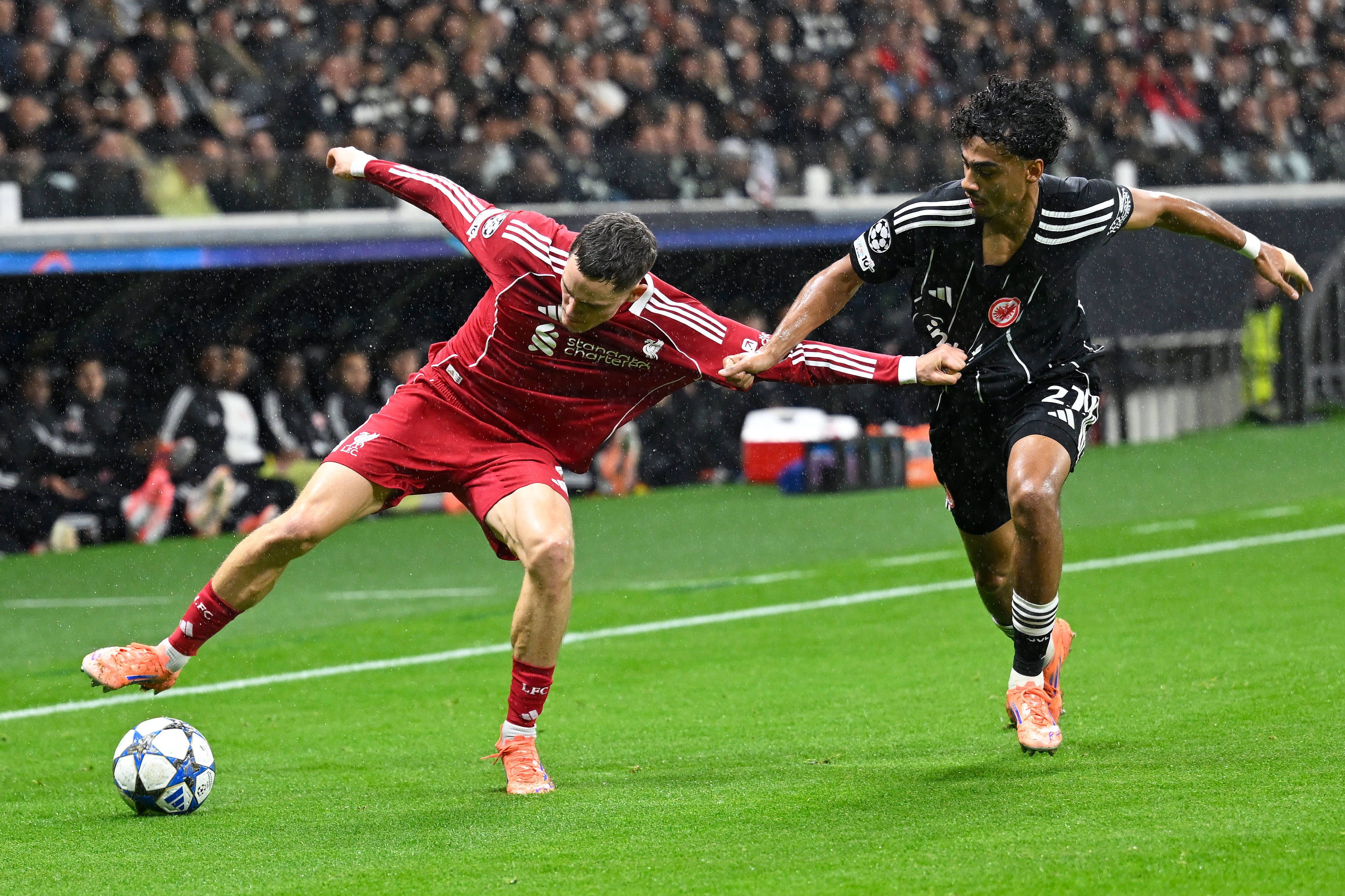 10月22日,法兰克福队球员布朗(右)与利物浦队球员沃茨拼抢。 新华社发(乌尔里希·胡夫纳格尔摄)