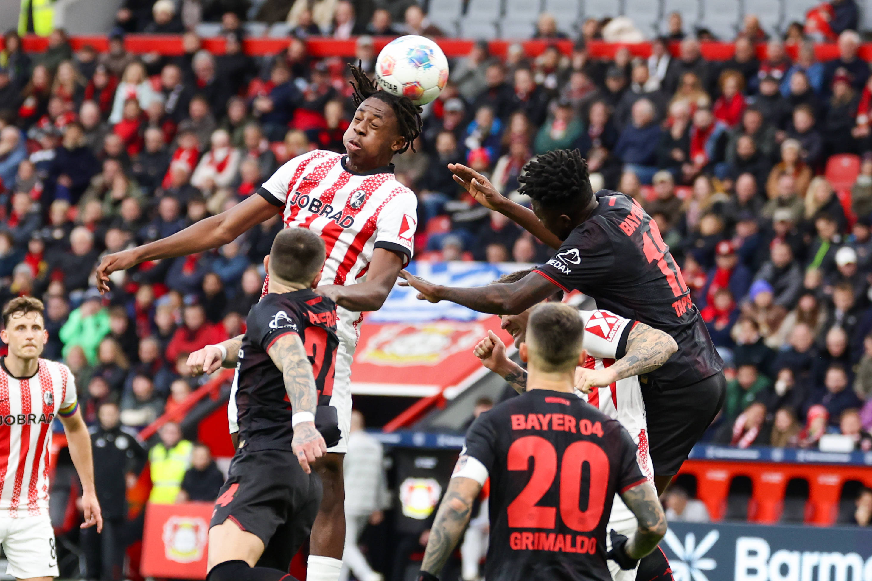 10月26日,勒沃库森队球员塔普索巴(右二)在比赛中头球攻门。 新华社发(约阿希姆·毕瓦勒兹摄)