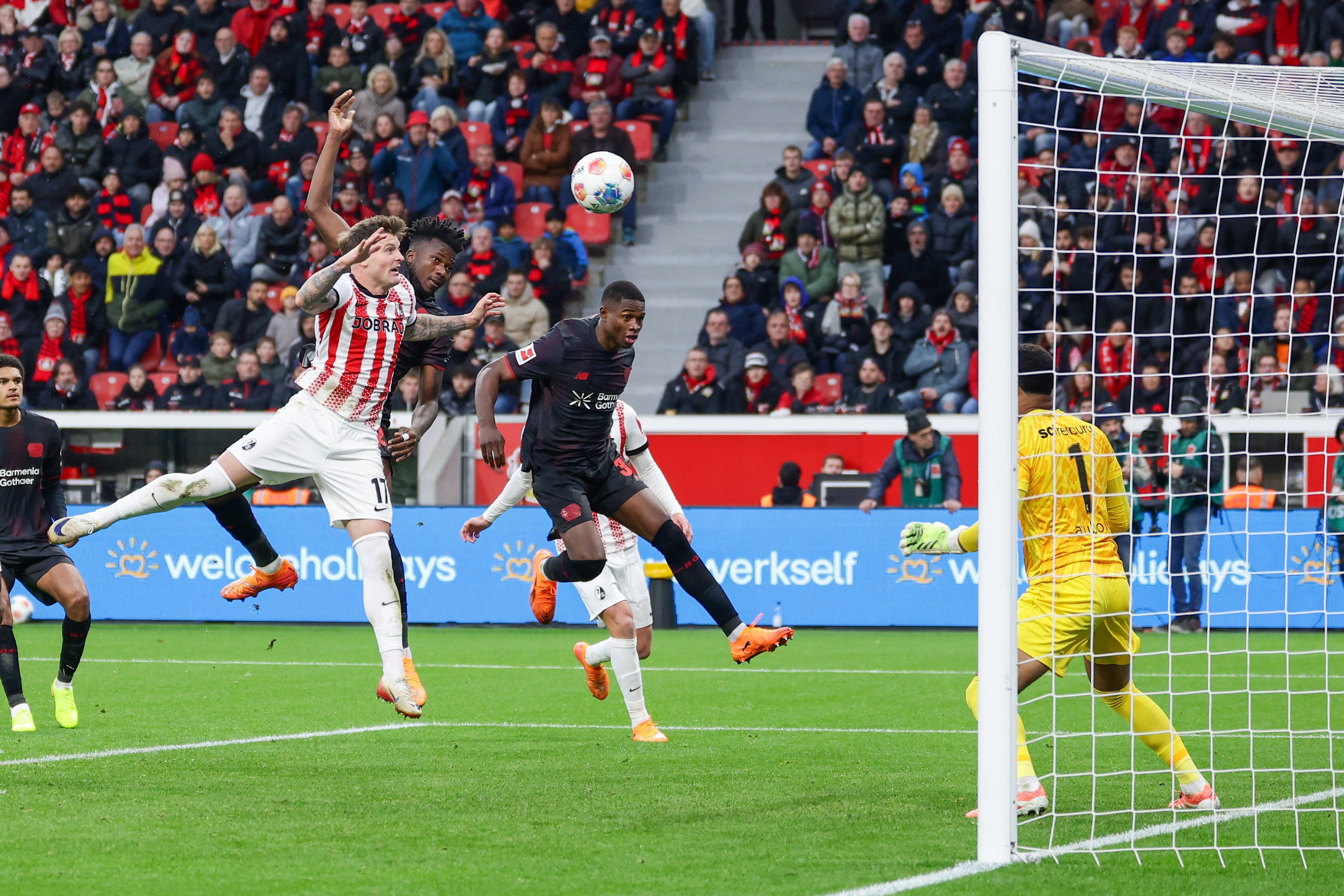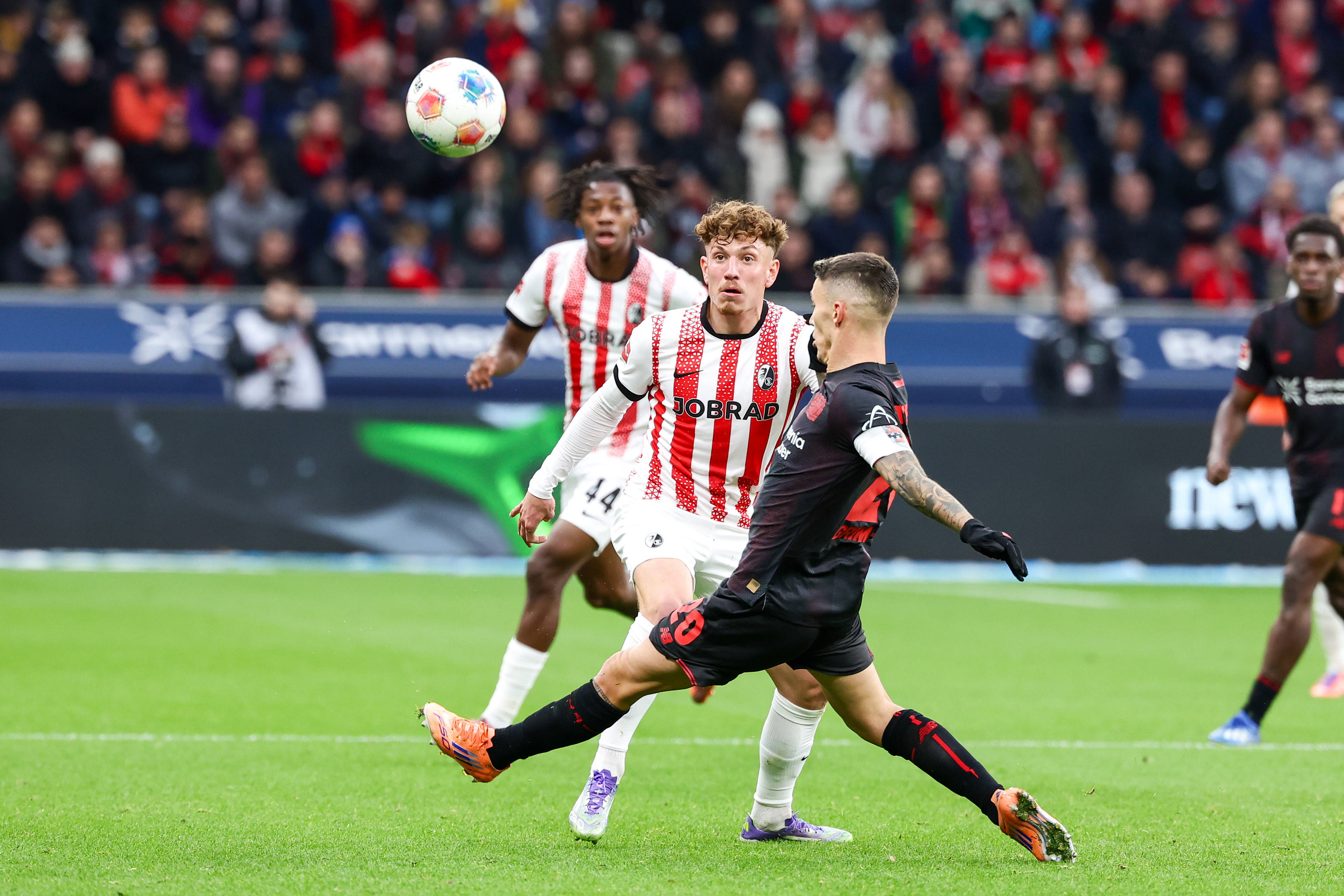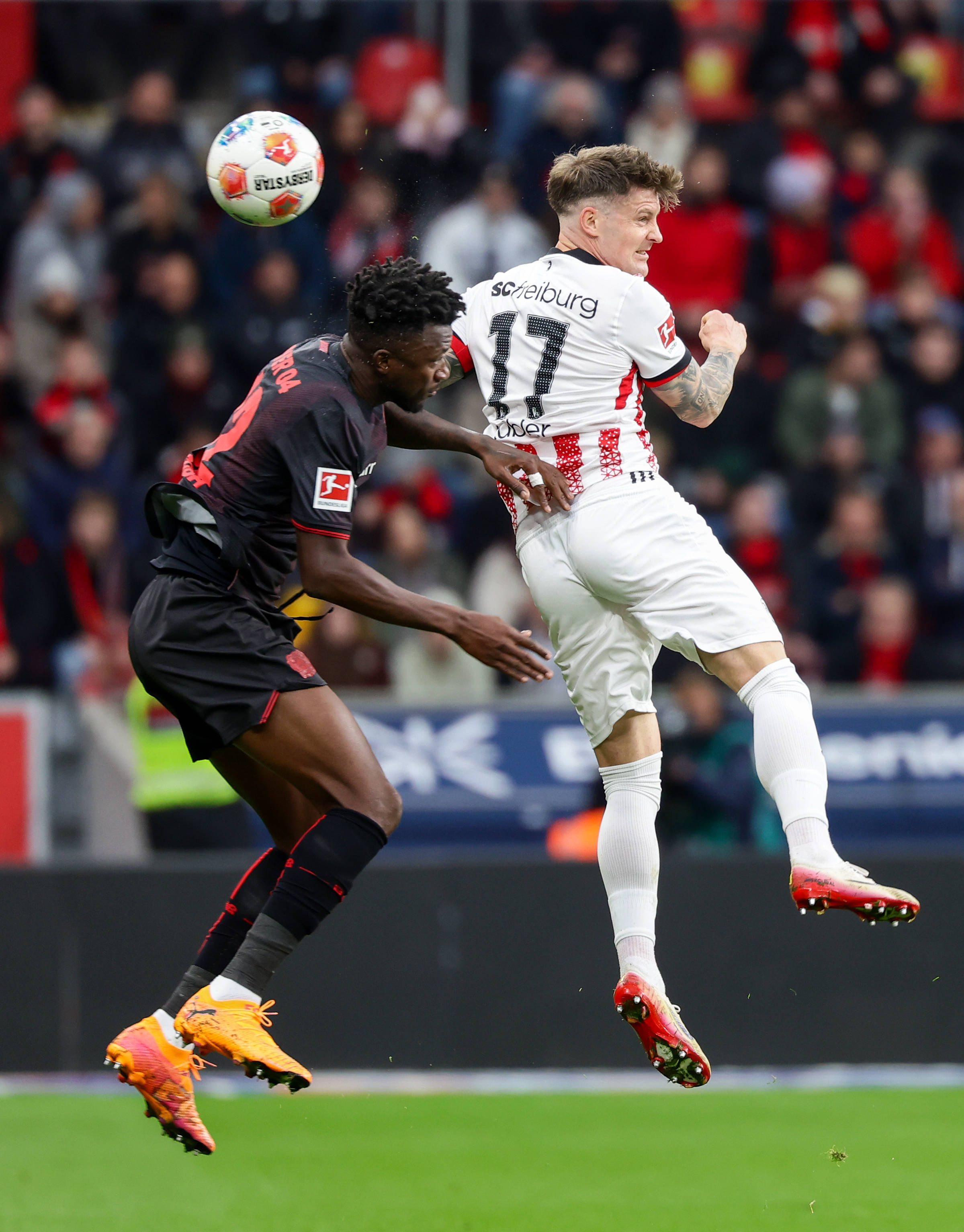10月26日,勒沃库森队球员塔普索巴(左)和弗莱堡队球员库布勒在比赛中争顶头球。 新华社发(约阿希姆·毕瓦勒兹摄)