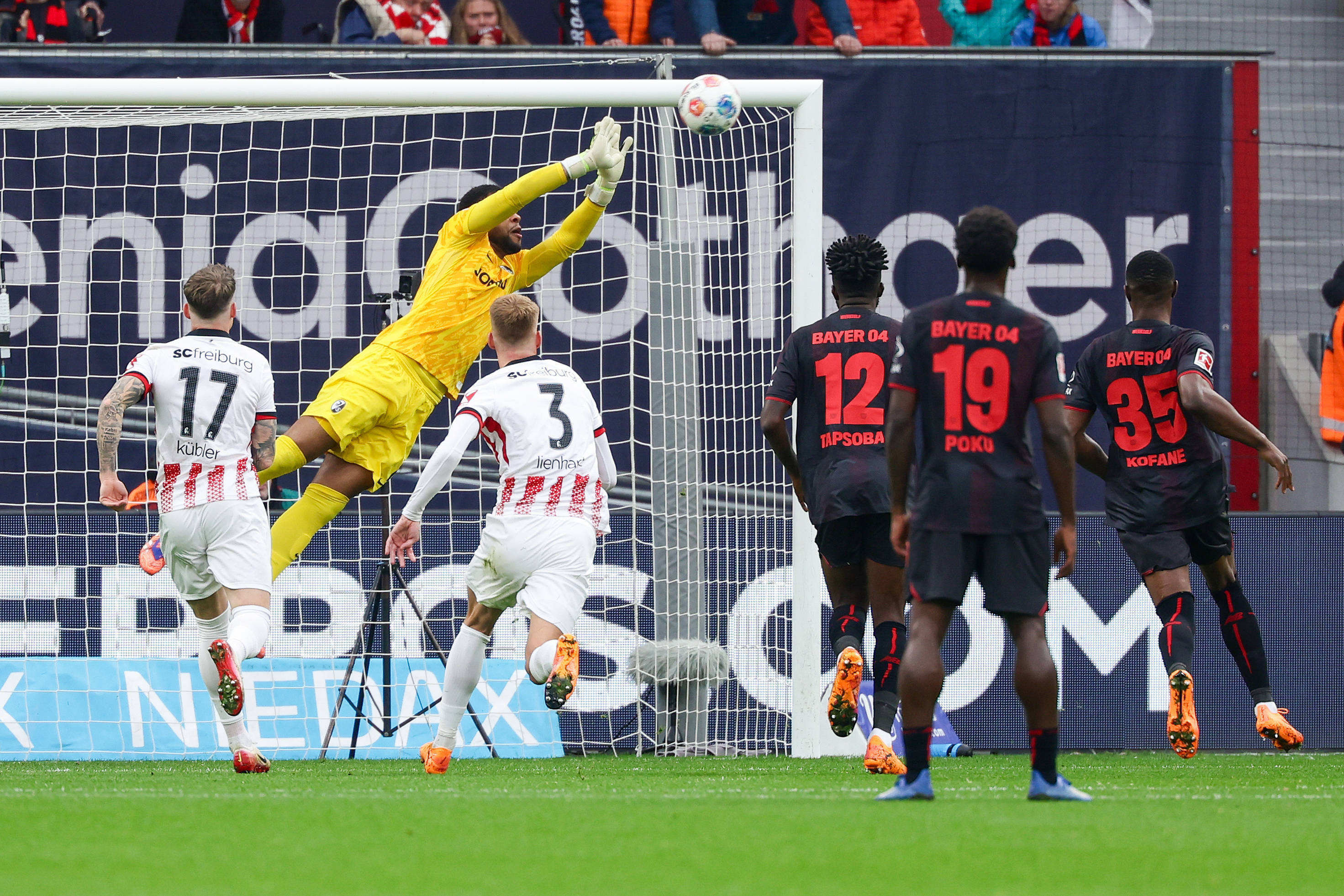 10月26日,弗莱堡队守门员阿图博鲁(上)在比赛中扑救。 新华社发(约阿希姆·毕瓦勒兹摄)