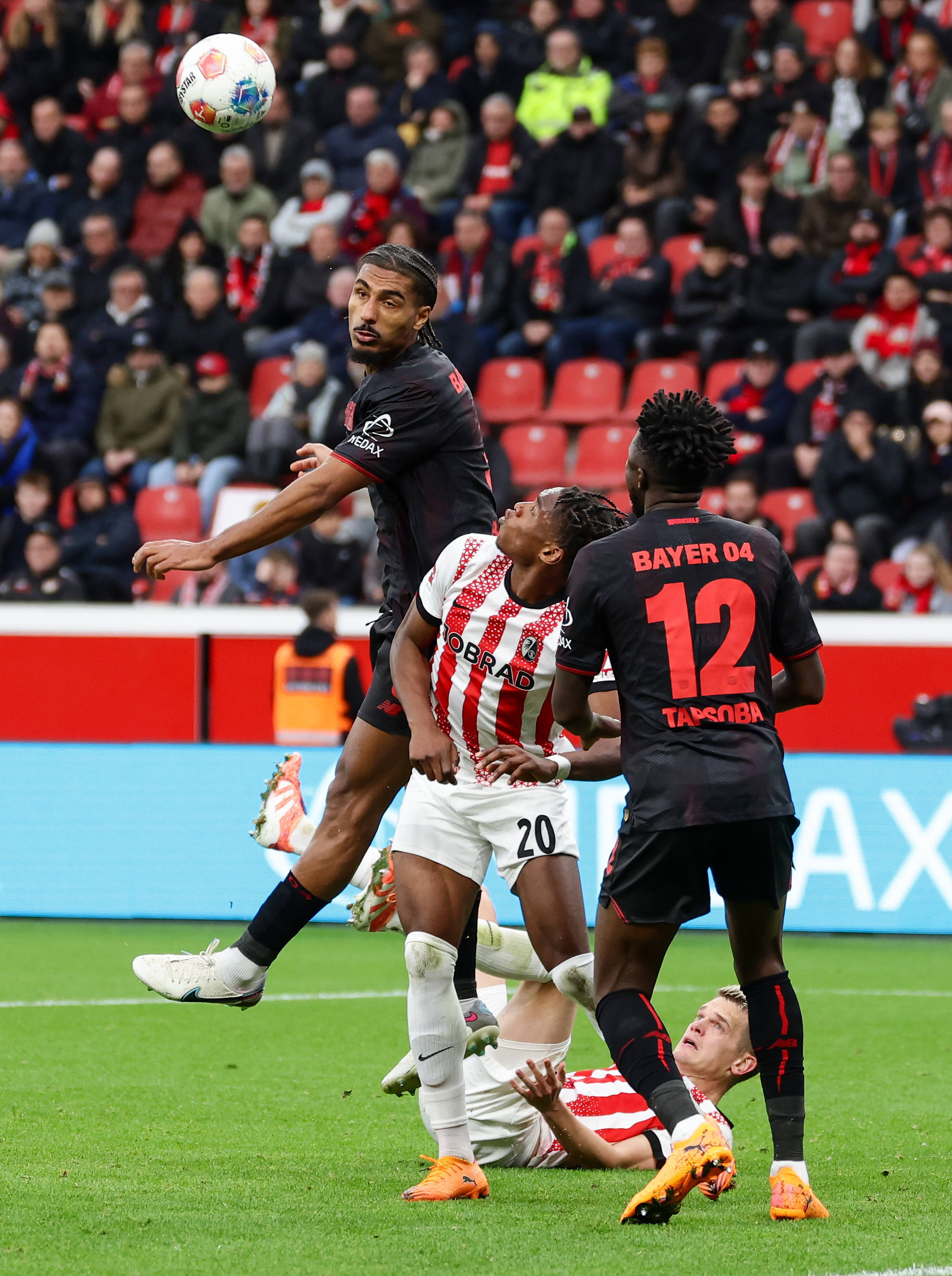 10月26日,勒沃库森队球员巴德(上)在比赛中争顶头球。 新华社发(约阿希姆·毕瓦勒兹摄)