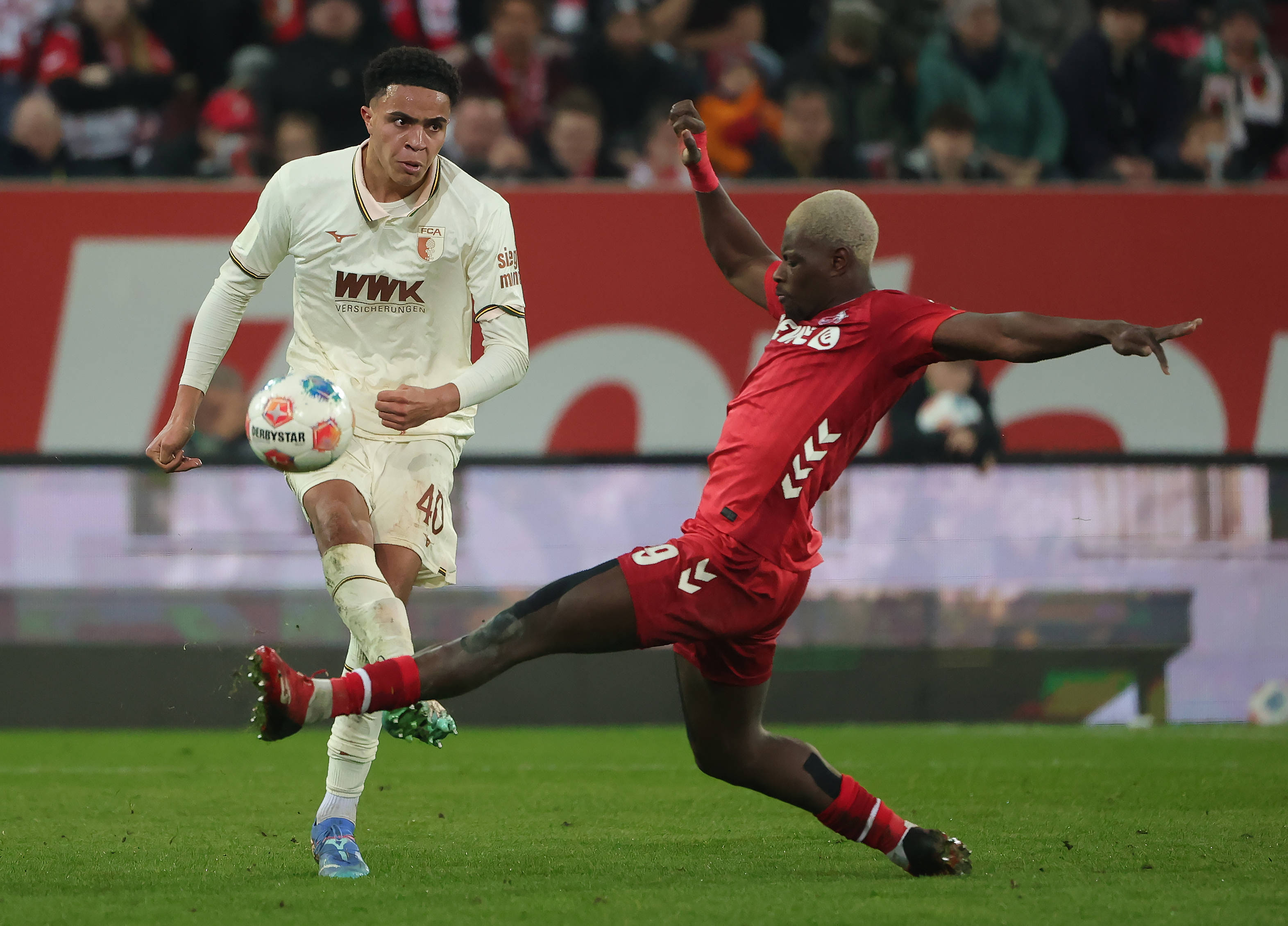 2月27日,奥格斯堡队球员莫里斯(左)与科隆队球员克劳斯在比赛中拼抢。 新华社发(菲利普·鲁伊兹摄)