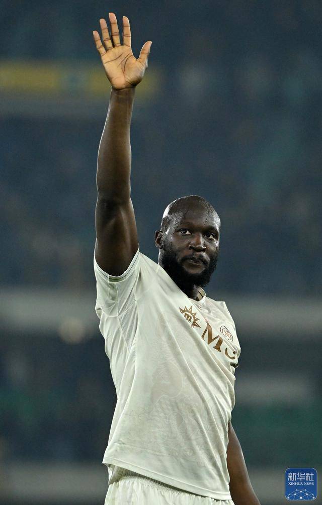↑ 那不勒斯队球员卢卡库在赛后庆祝胜利。