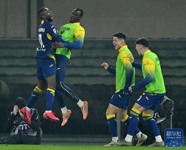 ↑ 维罗纳队球员阿克普洛(左一)与队友庆祝进球。