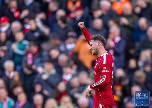 ↑ 利物浦队球员麦卡利斯特在比赛中庆祝进球。