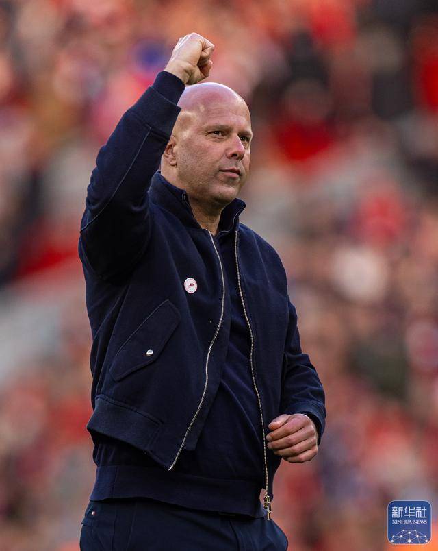 ↑ 利物浦队主教练斯洛特在赛后庆祝胜利。
