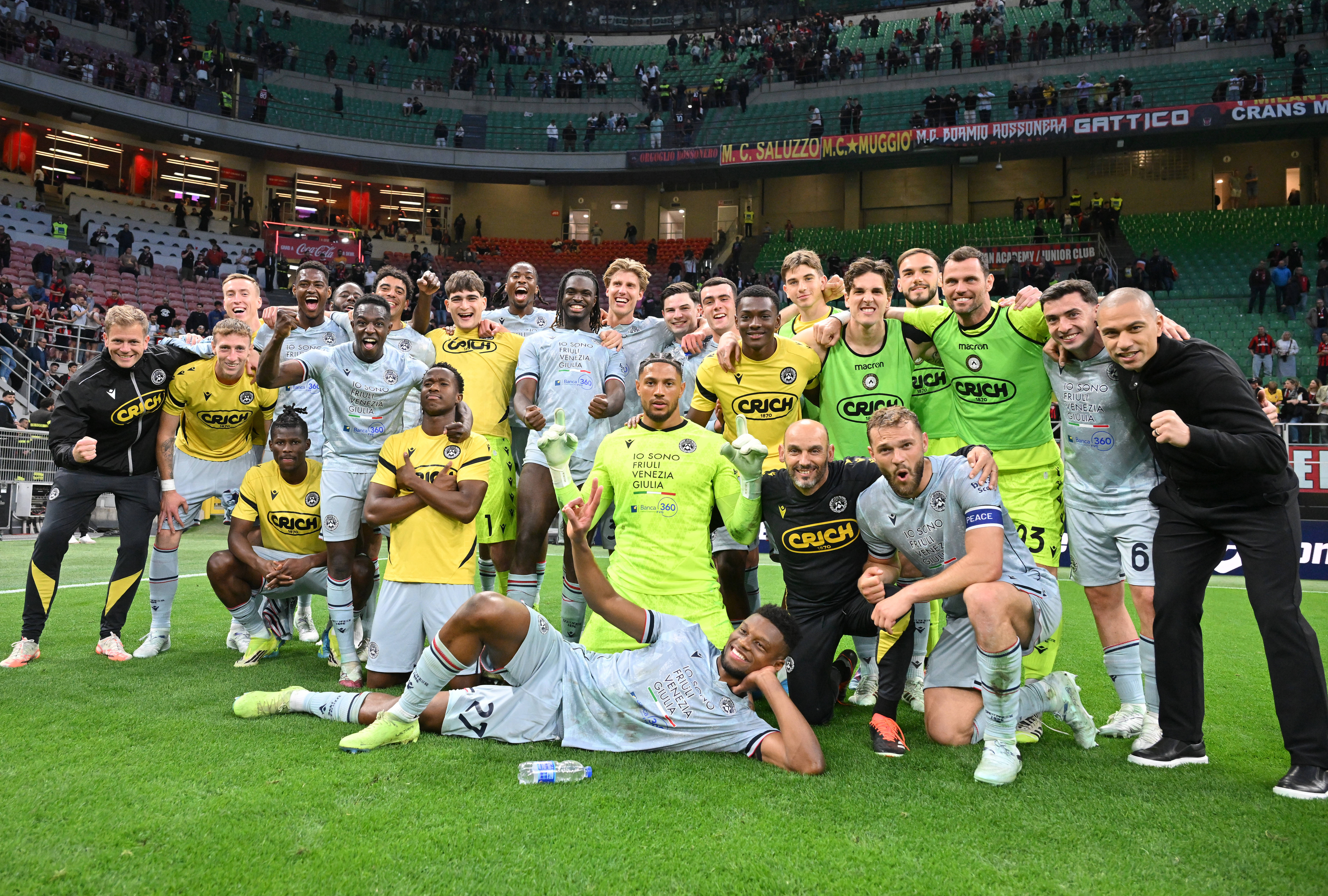 4月11日,乌迪内斯队球员在比赛后庆祝胜利。 新华社发(阿尔贝托·林格利亚摄)
