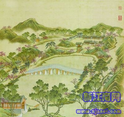 该图为圆明园四十景中的“曲院风荷”,图中九孔桥西北侧的长堤便是“苏堤春晓”。