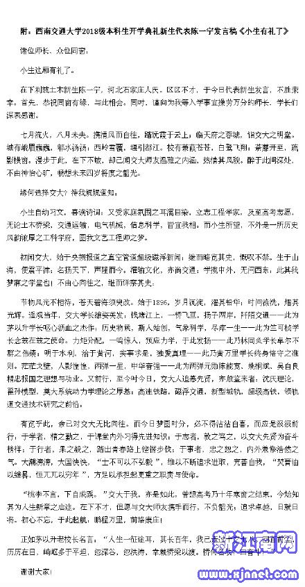 今年西南交大开学典礼的新生发言不同寻常,陈一宁发言稿通篇采用了文言文的形式。不得不说,现在的孩子真的是越来越优秀了……还有人没看到?一起来看——《小生这厢有礼了》!