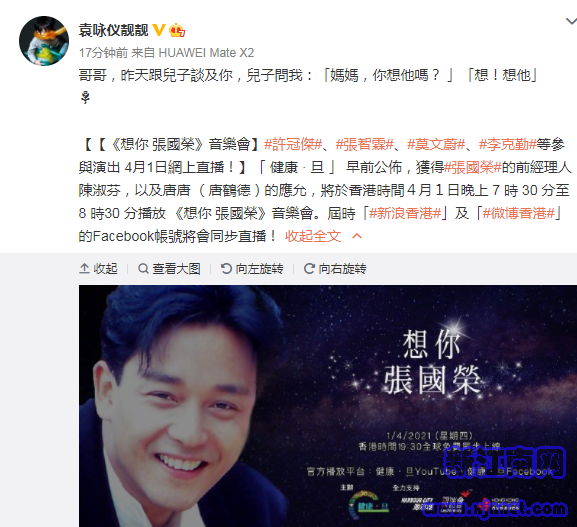而袁咏仪也在零点刚过发文缅怀:哥哥,昨天跟儿子谈及你,儿子问我:妈妈你想他吗?想,想他。
