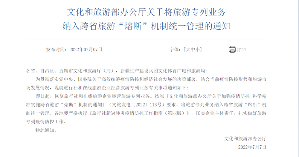 即日起,恢复旅行社和在线旅游企业经营旅游专列业务。按照《文化和旅游部办公厅关于加强疫情防控 科学精准实施跨省旅游“熔断”机制的通知》(文旅发电〔2022〕113号)要求,将旅游专列业务纳入跨省旅游“熔断”机制统一管理。各地要严格执行《旅行社新冠肺炎疫情防控工作指南(第四版)》,压实企业主体责任,扎实做好旅游专列疫情防控工作。