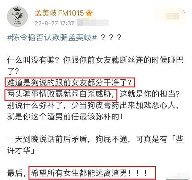 陈令韬的一番言论也引来了孟美岐工作室的回怼,直指前者“两头欺骗”“没担当”“加戏”,还和张天爱、古力娜扎、江铠同站在了同一立场,呼吁女孩子们“远离渣男”。