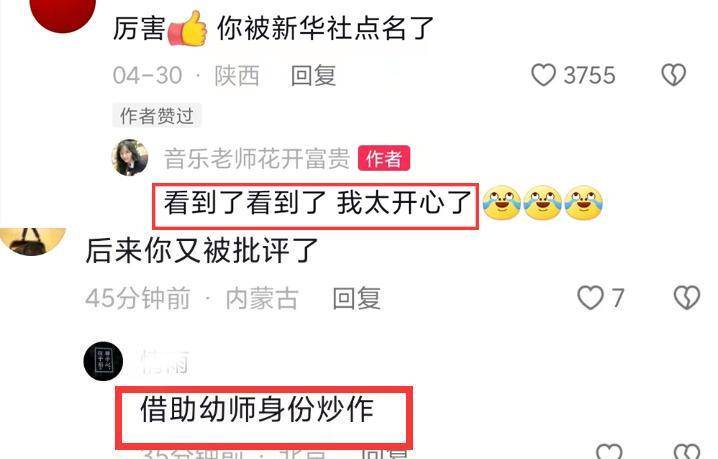 4月底,黄老师被新华社点名,有网友给她报喜,她本人十分开心,但很快新华社的视频就删除了。