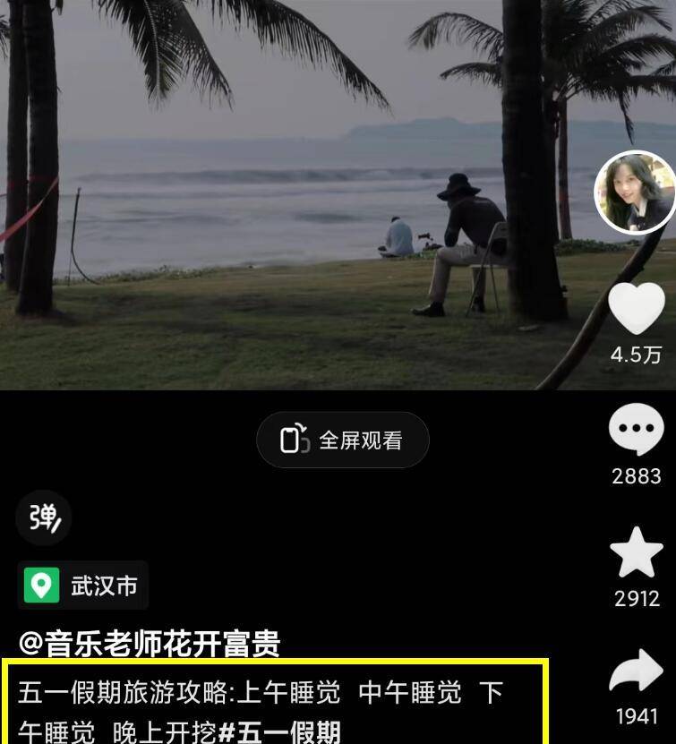 黄老师称自己五一的旅游攻略是:上午睡觉,中午睡觉,下午睡觉,晚上开挖。但看她视频拍摄的运镜和构图,很显然是专业设备+专业人员。