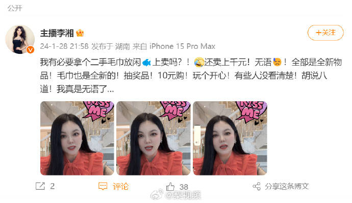 搜狐娱乐讯 1月28日,李湘发文回应网传在二手平台1560元出售二手毛巾。她表示,有必要拿个二手毛巾上卖吗?!还卖上千元!全部是全新物品!毛巾也是全新的!有些人没看清楚!胡说八道!我真是无语了。
