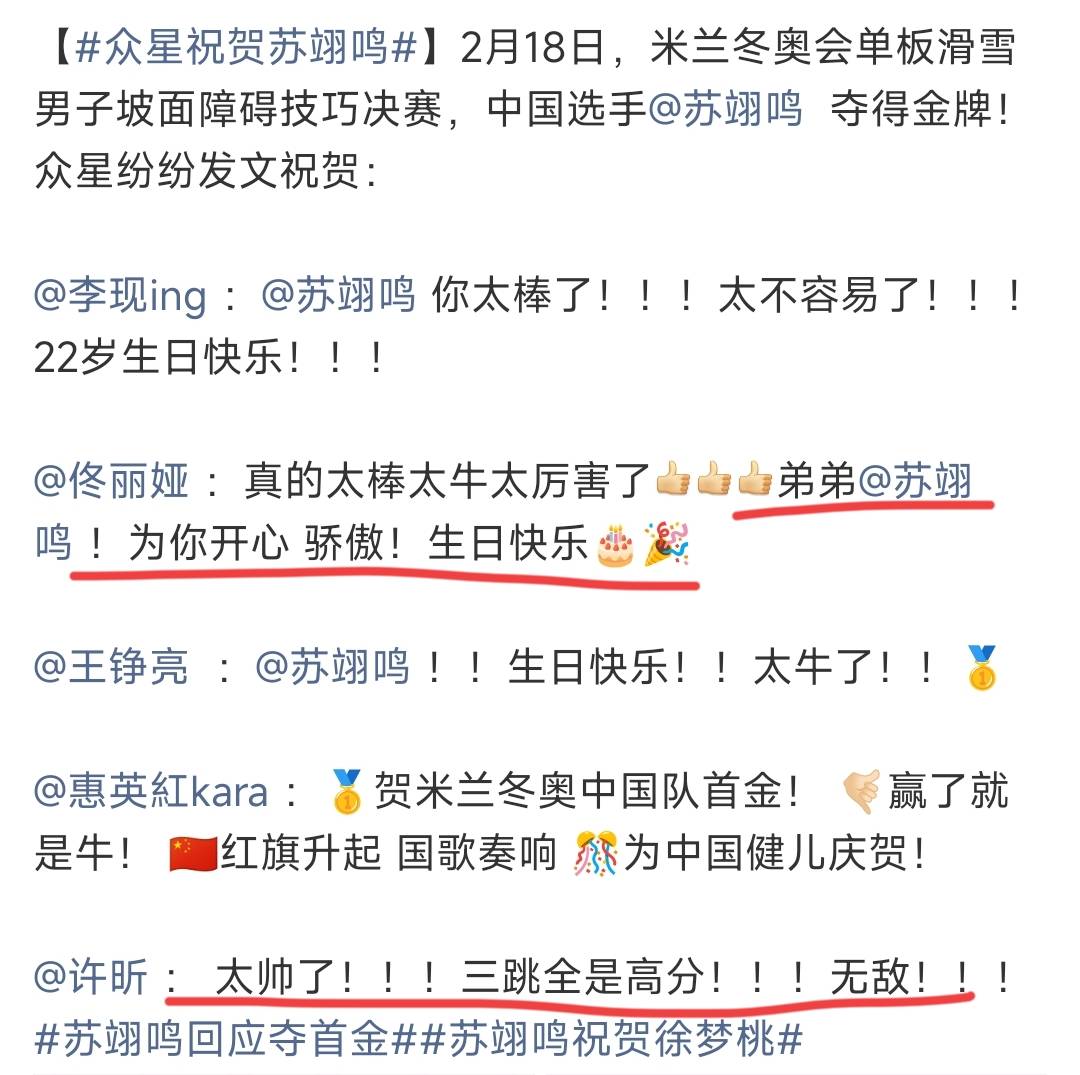 而苏翊鸣在娱乐圈、体育圈的明星好友们,也迅速发文恭喜苏翊鸣助力中国队拿下米兰冬奥会的首枚金牌。