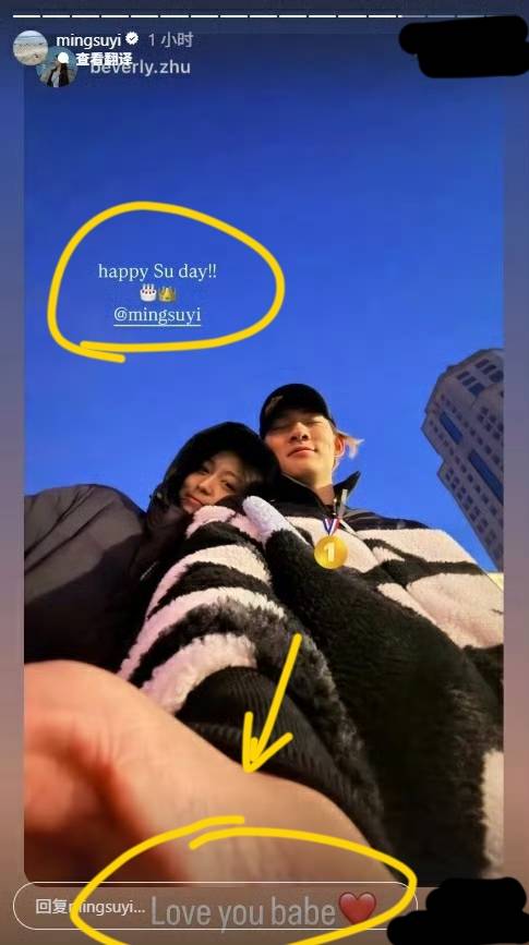 苏翊鸣和花样滑冰运动员女友朱易在社交平台上甜蜜互动。朱易写的是:happy Su day!并艾特了苏翊鸣。