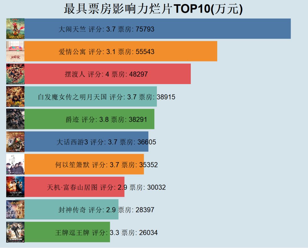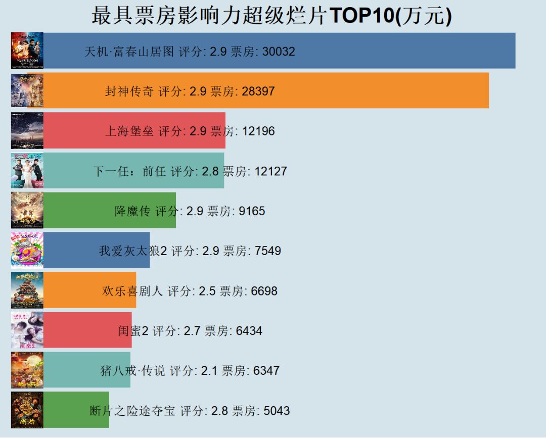 烂片票房榜中的TOP10都超过了2.6亿,大闹天竺和爱情公寓更是分别收获了7.5亿和5.5亿的票房,疯狂收割着大家的智商税,相信未来随着大家对影片要求的提高,疯狂收割智商税的现象会逐渐减少。