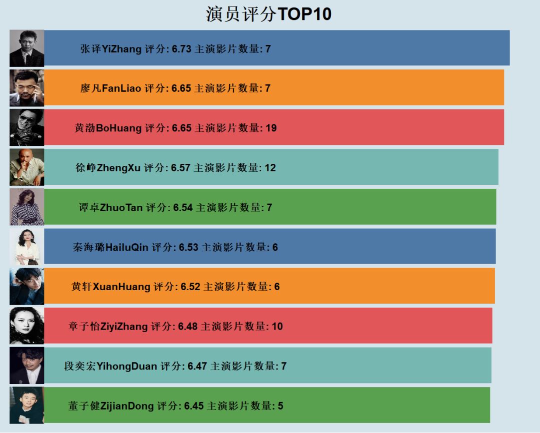 评分高的演员就无须赘述了,都是经过了市场和观众的挑战,但是目前还没有一位演员在主演影片数量超过5部之后,分数可以上7,诚然有一部分是因为豆瓣对国产的严格要求,但另一方面也在敦促电影人不断进步。